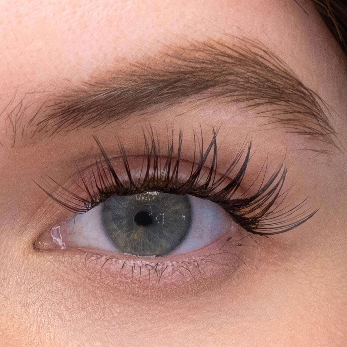 • Aplica una capa moderada de GLUE (cepillo de rímel) en tus pestañas naturales. Espera 3 segundos para que el adhesivo se vuelva pegajoso antes de aplicar los segmentos de pestañas.